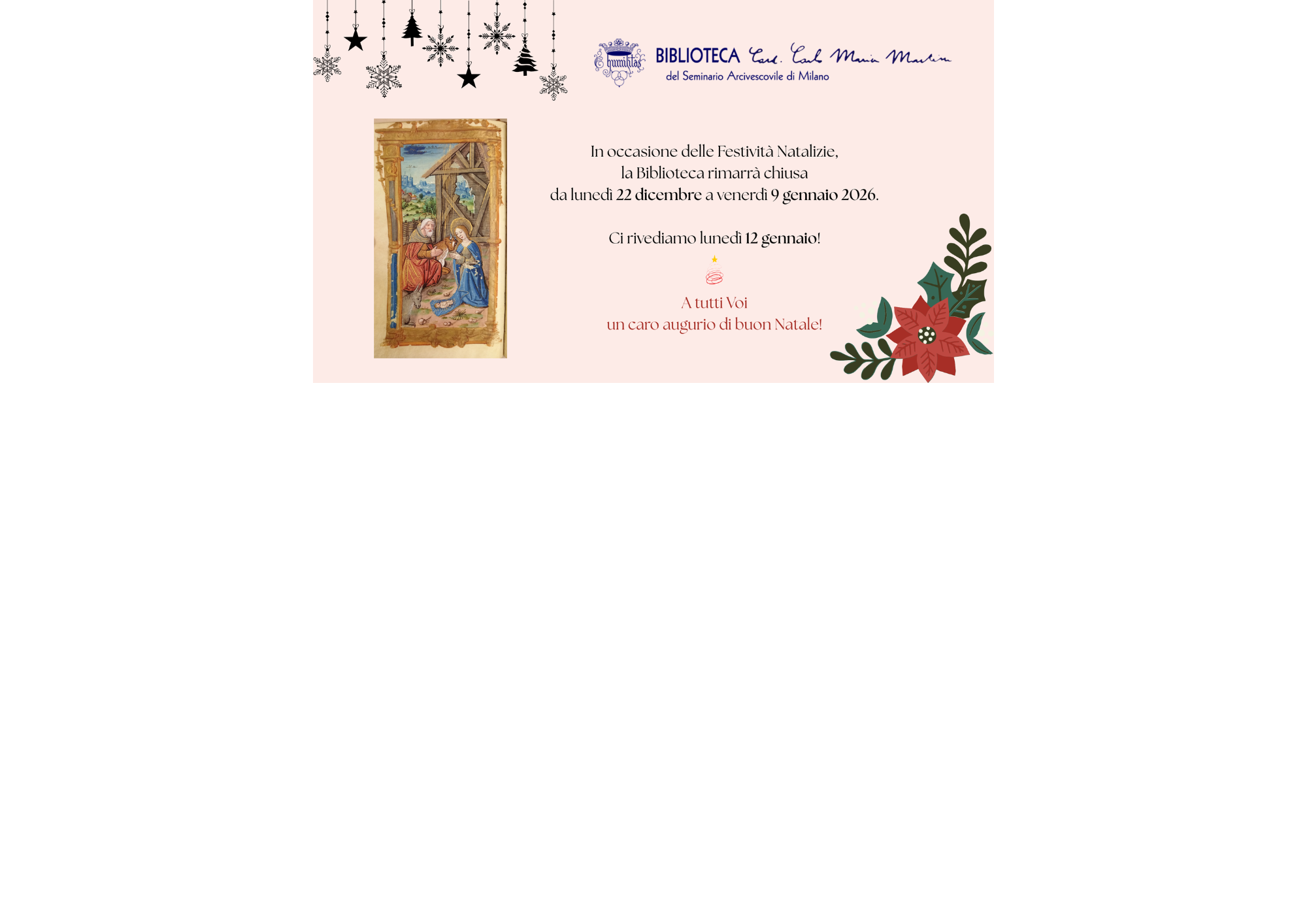 In occasione delle Festività Natalizie, la Biblioteca resterà chiusa dal 23 dicembre 2024 e riaprirà il 7 gennaio 2025. Auguri di un Santo Natale!
